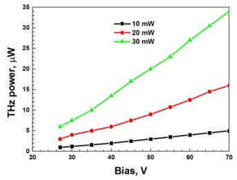 图3. 太赫兹发射器的辐射功率与偏置电压的关系