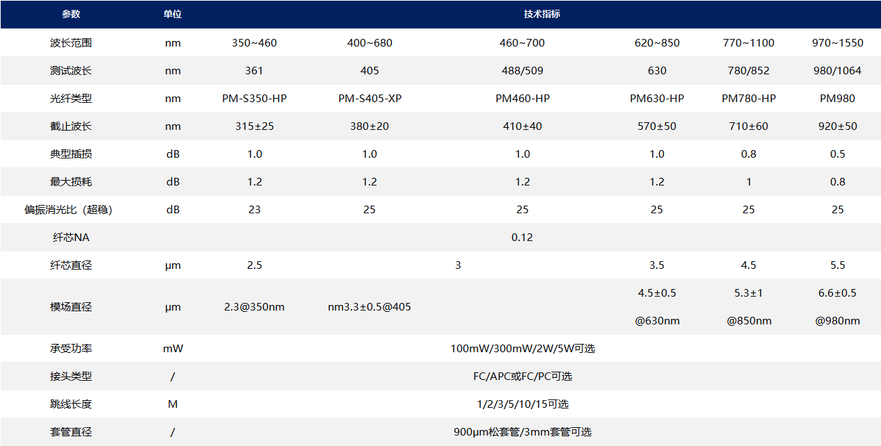 定性、低插入损耗及高消光比,在量子精密测量、量子计算和光纤传感领域应用的理想选择。波长范围从400 nm-2200 nm可选,目前有FC/PC和FC/APC两种接头类型可选。可提供多种保偏光纤定制服务,包括光纤长度、消光比及工作波长等。