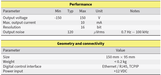 设备支持 **±150V 数字可调输出 **(可定制更高电压),标配16 位数字设定、最大输出电流10mA(可定制大电流版本),带宽30kHz(可升级至约 400kHz),整机噪声低至100–120μV,高压输出下噪声性能行业领先。