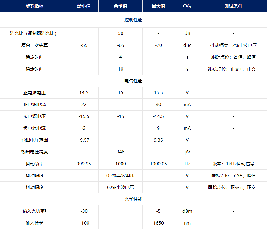 注3:输入光功率并非指选定偏置点的光功率,而是指偏置电压在-半波电压至+半波电压范围内,调制器可输出至控制器的最大光功率。