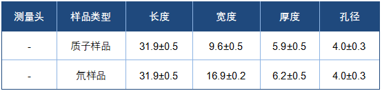 测量头尺寸(质子样品,毫米):长度179.0±0.5、宽度9.4±0.2、厚度1.45±0.05