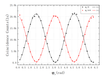 典型的偏振纠缠光源(405->810nm标准产品)的干涉曲线如图2所示。图中黑色曲线和红色曲线分别为正交基矢下和+/-45°基矢下的拟合结果。