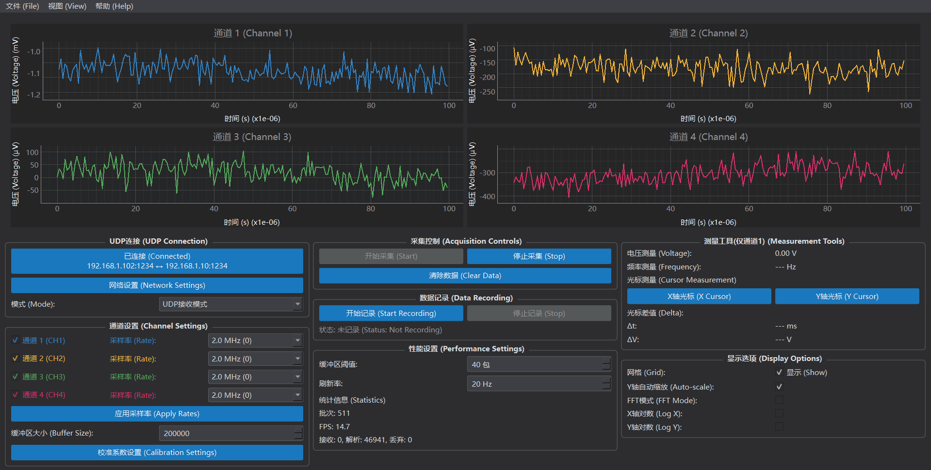 RS-LAN-4431是一款超低噪声、高精度、4通道同步采样的数据采集卡,采用网络接口通讯,集成24位高分辨率逐次逼近型A/D转换器,适用于声学分析、振动测试、电机控制和精密信号测量等领域。设备自带上位机并提供Python开发包。