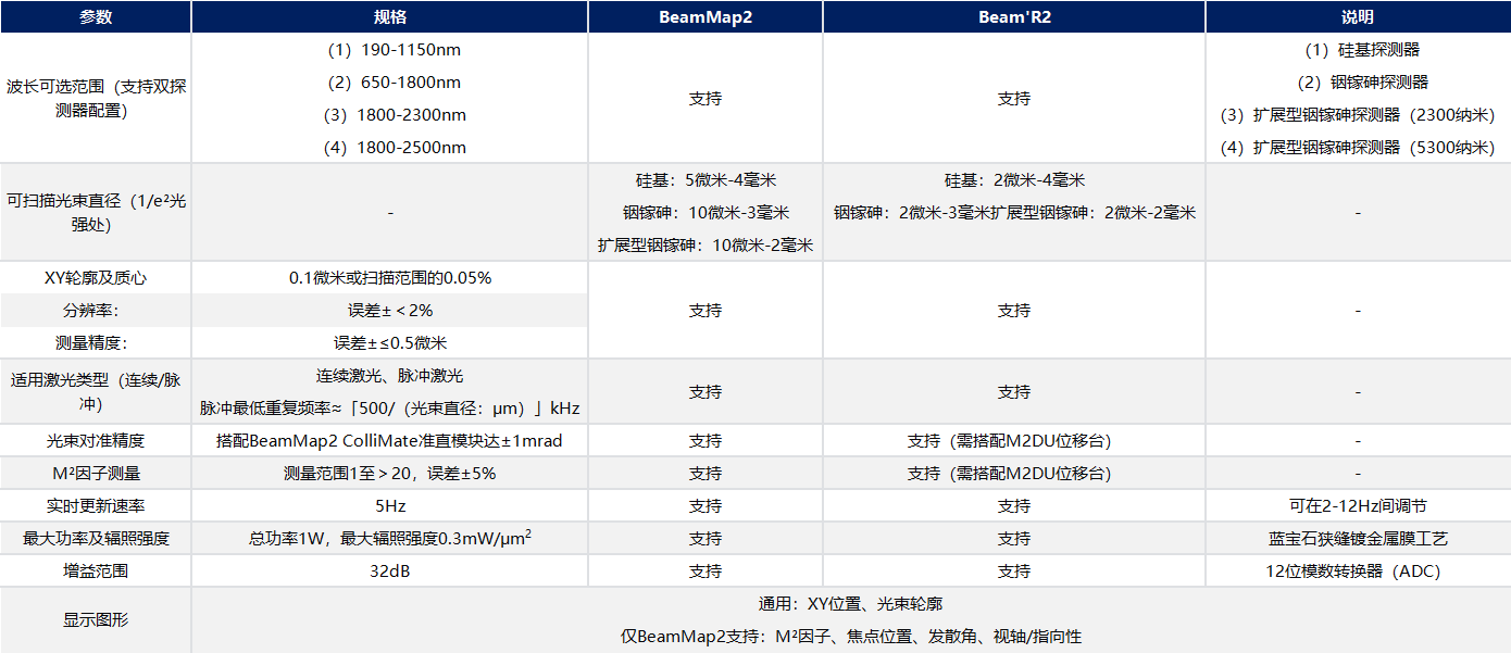 DataRay 公司的Beam'R2型光束轮廓仪适用于多种激光光束轮廓测量场景。该设备标配2.5微米狭缝,也可搭配大尺寸刀口狭缝,能对直径小至2微米的光束进行测量。通过选配硅基、铟镓砷或扩展型铟镓砷探测器,Beam'R2可实现190nm至2500nm波段的光束轮廓分析。相较基于相机的测量系统,扫描狭缝式仪器具备更高的测量分辨率。