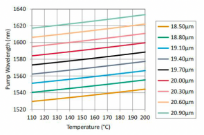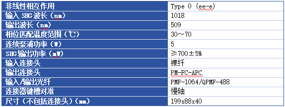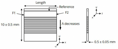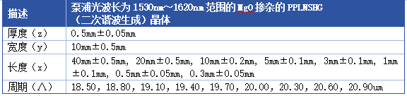 1.该倍频(SHG)器件的材料为掺镁铌酸锂,带有9个周期性极化光栅。每个光栅宽0.5mm,各自的周期如上所列。晶体的+z面上有一个锯切参考标记,用于确定最大的光栅周期(参见上面的图表)。每个极化光栅之间由0.2mm宽的非极化材料区域隔开。