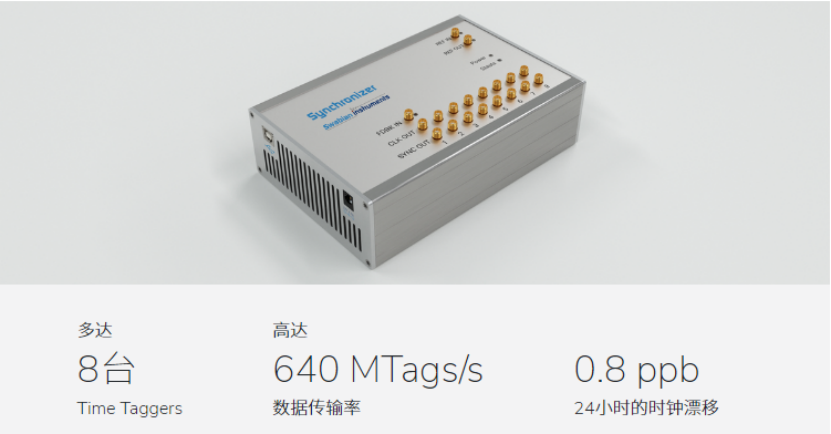 Synchronizer可以实现8台设备至多160个通道的信号同步,兼容Time Tagger Ultra和Time Tagger X的所有配置。