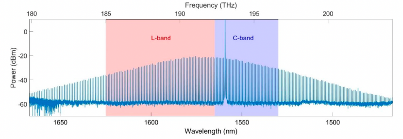 图1. DLT-DKS-BD-1550的光谱输出,具有100 GHz的自由光谱范围(FSR)