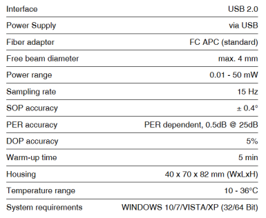特点:偏振态测量包括:四个Stokes参量、偏振消光比(PER)、偏振度(DOP)、椭偏度