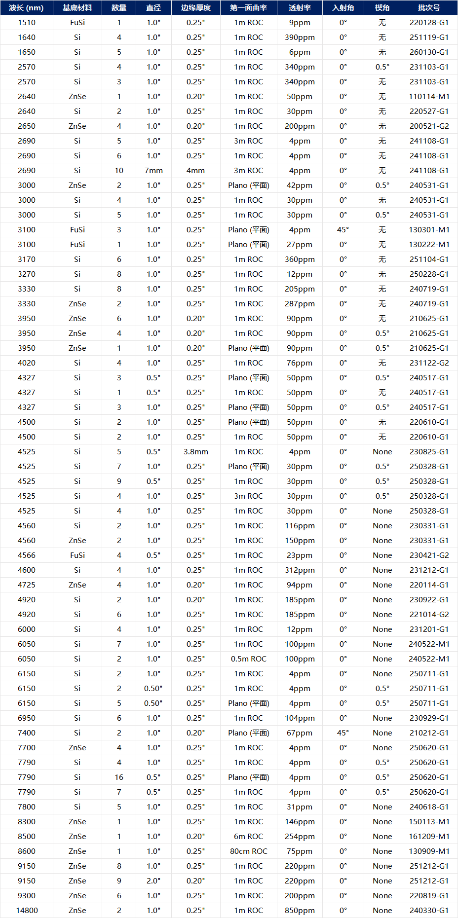 除定制镀膜服务外,我们还有少量反射镜现货可供选购。价格因镀膜设计与适用波长而异。我们很乐意解答关于各类库存产品的相关问题。
