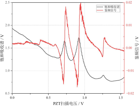 输出饱和吸收谱信号(黑线,包含多普勒背景), 经过解调得到鉴频信号(红线)。