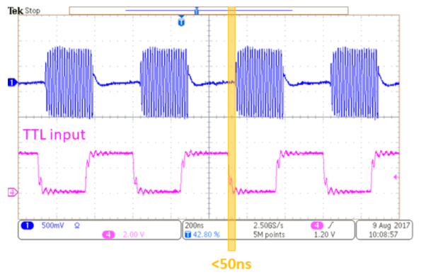 每个通道都可通过外部TTL输入进行控制,从而在极短的时间内(从输入到输出不到40纳秒)开关射频。这实现了快速脉冲生成