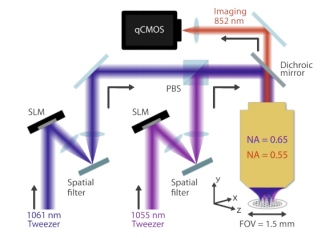 加州理工学院研究了一个大规模的光学镊子阵列,能够同时捕获超过6100个中性铯原子,分布在约12000个位置上。通过空间光调制器(SLM),物镜将光的相位图案聚焦到真空腔内,产生光学镊子阵列,用于捕获和控制原子。并且物镜还用于捕获原子在光学镊子阵列中的成像,检测每个陷阱中是否存在原子。