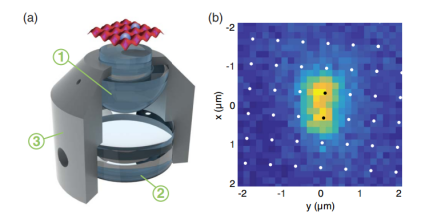 图6 (a)物镜的剖视图;(b)利用高数值孔径物镜获取的荧光图像,显示出两个被囚禁在二维光学晶格相邻格点中的铯原子[2]