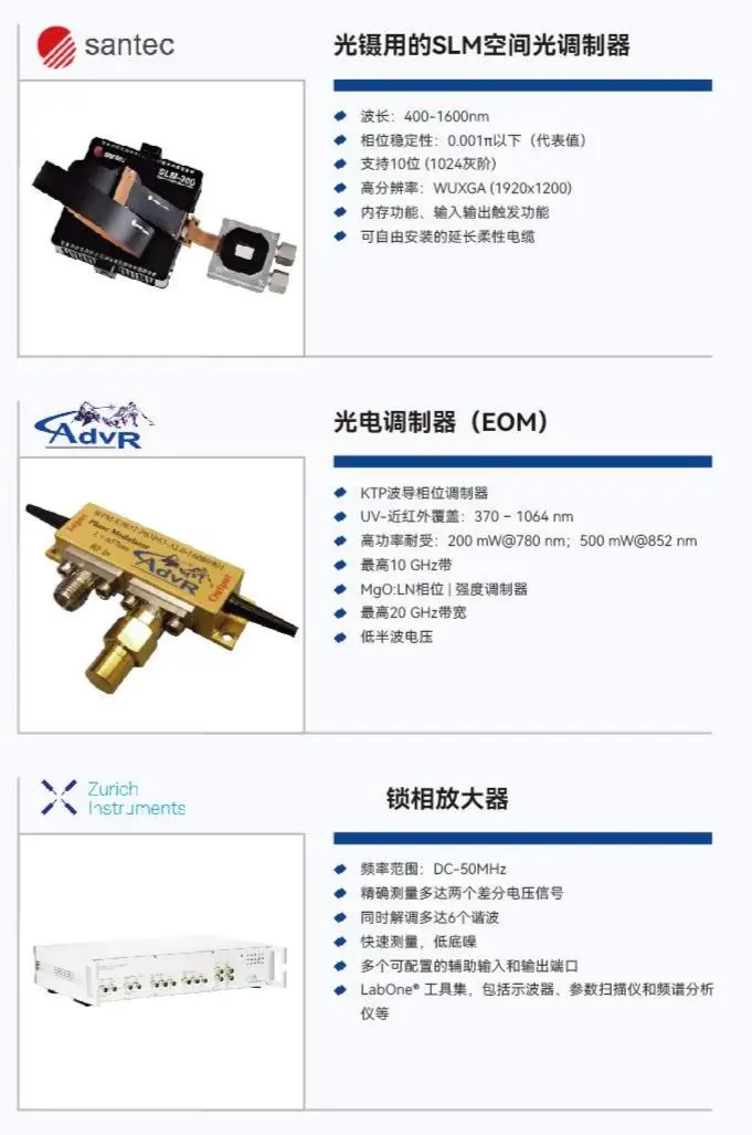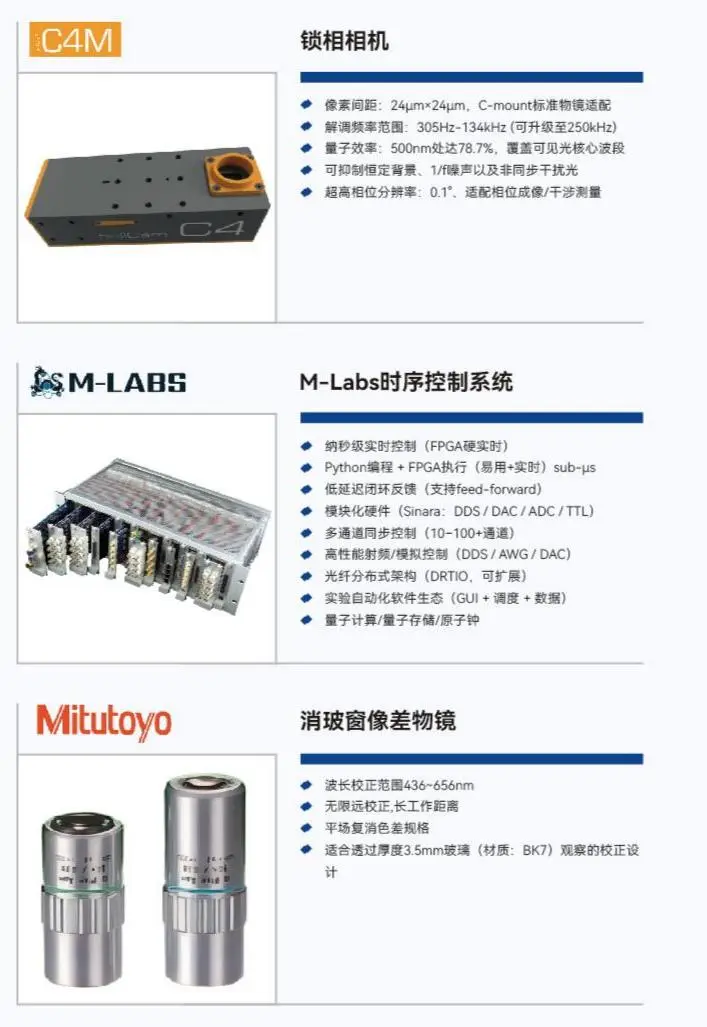 Swabian Instruments 皮秒精度时间数字转换器,实现亚皮秒级时间测量;M-Labs 时序控制系统、Redpitaya 火龙果开发板,实现高速信号处理与实时控制,也可做激光光路稳频;Mitutoyo 消球差物镜准直,搭配光电调制器(EOM)等核心器件,为光学实验提供极致精密支撑。