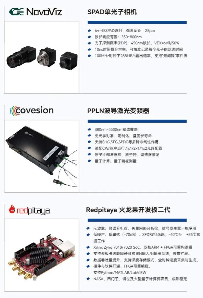Santec 的光调制器SLM,精准调控光信号,满足量子计算阵列调控与光电光束调控场景需求;Novaviz SPAD 单光子相机,实现单光子阵列成像、C4M 锁相相机,可以实现成像同时后端加锁相调制功能,功能强大。