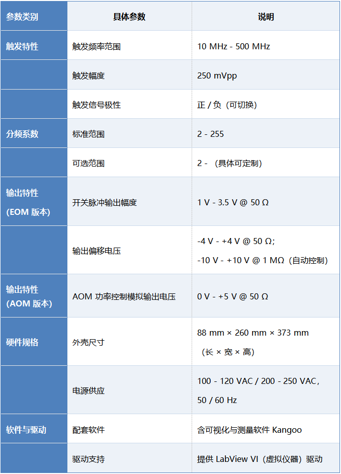 2. 核心作用:精准降低脉冲激光的重复频率,从连续脉冲序列中筛选出符合需求的特定脉冲,适用于激光加工、光谱分析、量子光学等需要低重复频率脉冲的场景。