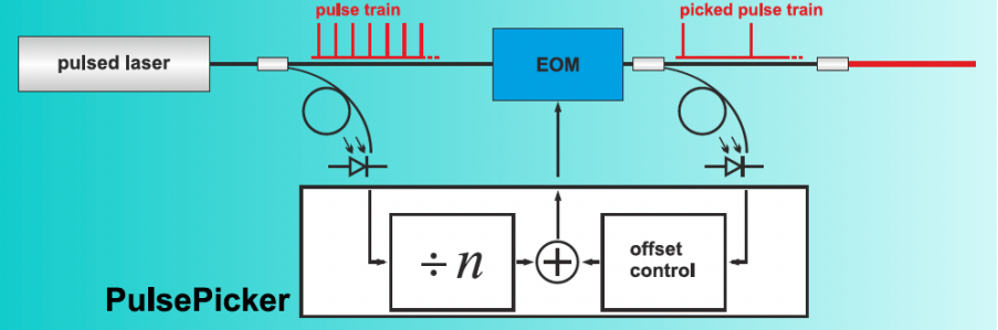 1. 工作流程:脉冲激光发出原始脉冲序列,进入电光调制器(EOM);PulsePicker 系统通过偏移控制(offset control)调节 EOM,筛选出目标脉冲序列,最终输出选通后的脉冲序列(picked pulse train)。