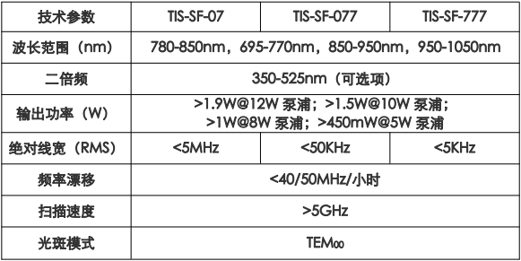TIS-SF-777可搭配TekhnoScan FD-SF-07 倍频腔工作,输出波长范围可拓展至紫外、蓝光波段,同时保证 5kHz 线宽。