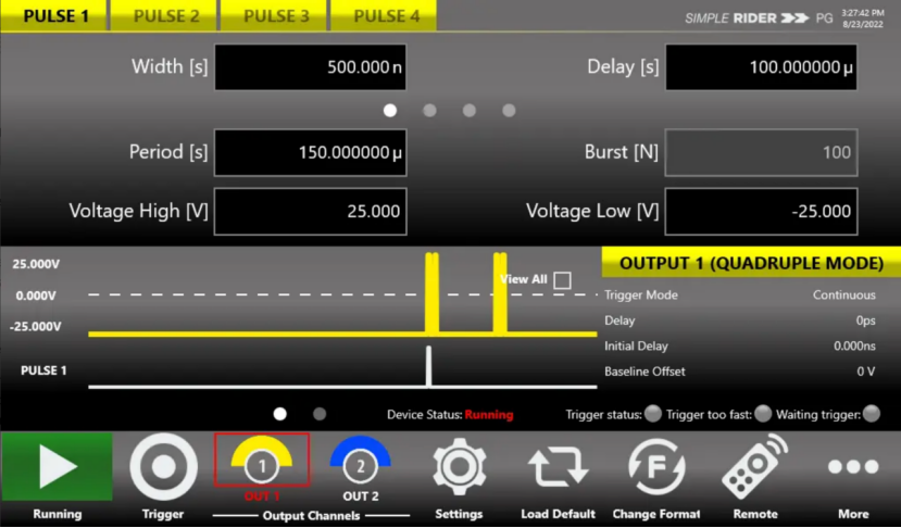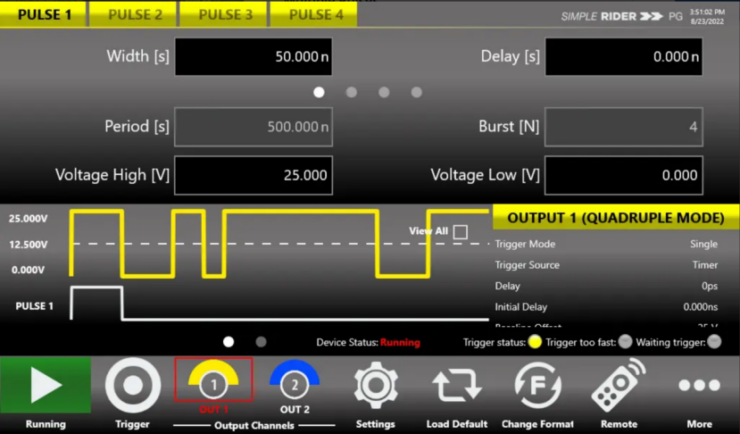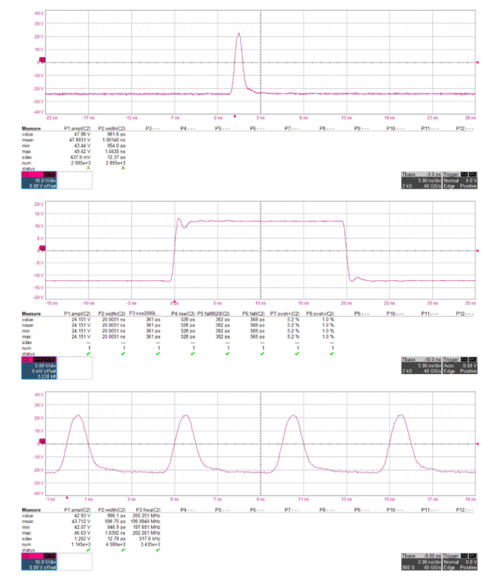 其创新的硬件架构能够生成多种脉冲序列,如双脉冲、三脉冲或四脉冲,且每种脉冲都具有完全独立的时序参数。Pulse Rider脉冲发生器的最高重复频率为400MHz,在50V电压下的最小脉冲宽度为1ns。