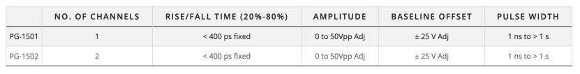 PG-1500 系列脉冲发生器可提供低于 400 ps的快速边沿、±25 V的基线偏移以及 1ns至 1 s的脉冲宽度,因此它可能是为短脉冲、慢脉冲测试生成脉冲的理想仪器。