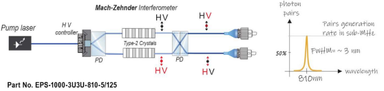 810 nm窄带偏振纠缠光子源,基于马赫 - 曾德尔干涉仪 +Ⅱ 型 SPDC生成偏振纠缠光子对,中心波长 810 nm、带宽几纳米。设备配备波长稳定泵浦激光器、可变光衰减器与温控模块,保障相位匹配与转换效率;集成半波片可调控光子对数量,支持在偏振与能量域间切换纠缠态,适用于量子光学研究