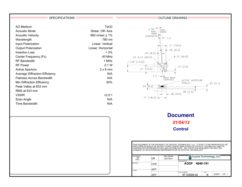 订单型号(型号、参数) Wavelength(nm) Operating frequency(MHz) Active aperture(mm) Integrated driver Optical AOMO3080-125 440-850 80 2 No TeO₂ AOMO3100-125 440-850 100 1.5 No TeO₂ AOMO3200-1214 440-850 200 1.5 No TeO₂ AOMO3270-125 440-850 270 1.5 No TeO₂ AOMO3350-125 440-850 350 1.5 No TeO₂ I-FS040-1.S2C-3-GH83 532 40 1.5 No TeO₂ I-FS040-1.5S2C-1-GH66 532 40 1.5 Yes TeO₂ I-FS080-3S2E-1-GH39 633 80 3 Yes TeO₂ I-FS040-2S2E-1-GH66 630-690 40 2 Yes TeO₂ I-FS040-2S2E-3-OL3 630-690 40 2 No TeO₂ AOFS4040-191 633-1064 40 2x6 No TeO₂ I-FS080-2S2G-3-LV1 1064 80 2 No TeO₂ I-FS040-23SJ-3-GH53 1550 40 2 No TeO₂ I-M040-2C8J-3-GH84 1550 40 2 No Chalcogenide