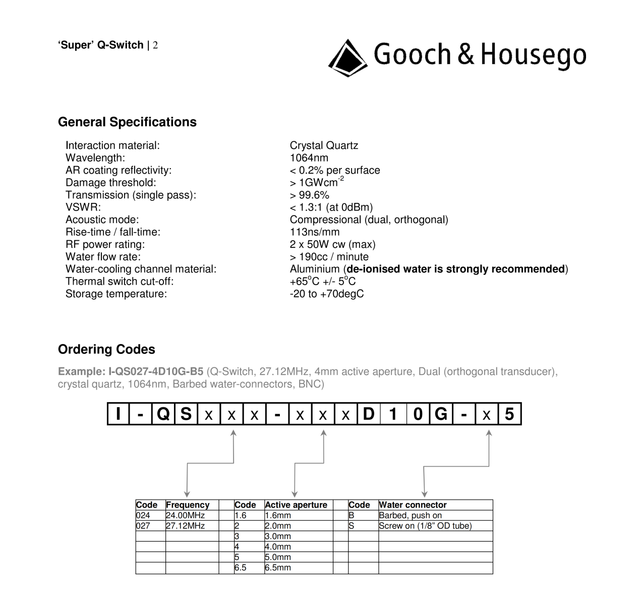 Industrystandardq-switch | 1064 | 3,4,5 | 24,27.12,40.68 | Fusedsilica | Water |