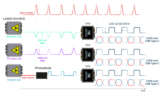 具备4路数字孪生输出,功能表现优异:2路输出通过SMA连接器实现,输出电压2.5伏、阻抗50欧姆,可无缝融入现有实验系统;另外2路输出通过USB Type-C接口实现,采用低压差分信号协议,可与本品牌荧光寿命成像数据采集卡即插即用,连接便捷。