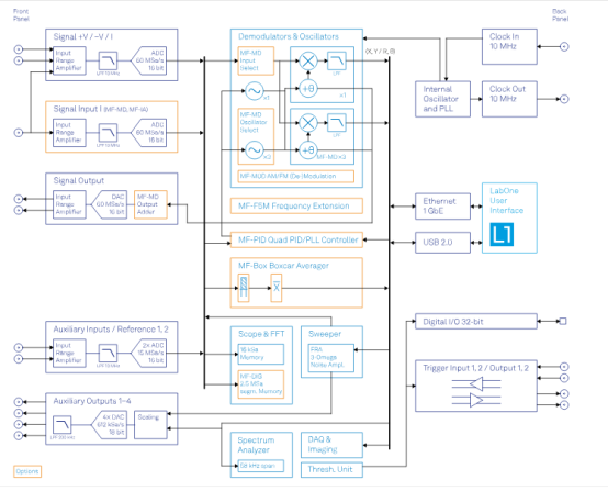 仪器标配支持电压测量或电流测量,如需同时测量电流和电压则需要 MF-MD 多解调器选件的支持。模拟前端拥有可变输入阻抗和交流/直流耦合选择,以及高频过采样技术,来确保优越的锁相性能和示波器的高保真度。