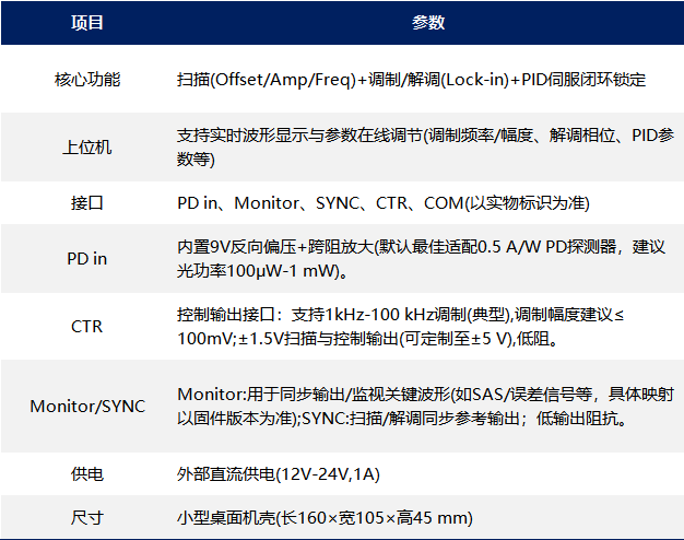 • PID 伺服可调:P/I/D 参数独立调节,便于快速获得稳定锁定;反馈带宽 > 2 kHz(典型)。