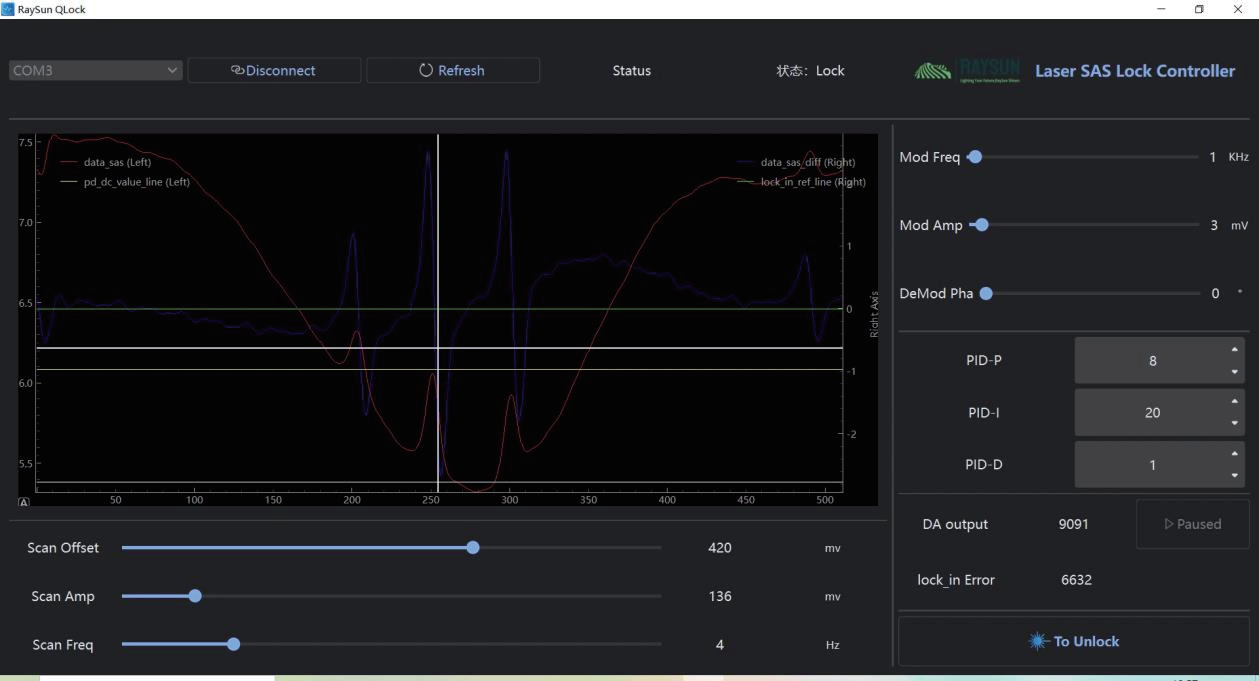 QLock 上位机软件支持串口连接与实时显示,可同时显示饱和吸收谱(SAS)信号、误差信号与锁定参考线,并支持扫描参数、调制/解调参数与 PID 参数的在线调节,便于快速获得高信噪比误差与稳定锁定状态。软件界面: