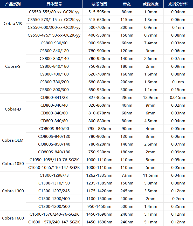 Wasatch Photonics的Cobra OCT光谱仪可以针对各种应用进行定制。这些光谱仪可以实现超过12mm的成像深度,成像分辨率低于2µm,光谱宽度大于500 nm,光谱分辨率低于0.02 nm。相机选项包括e2v Octoplus、Dalsa Piranha和Sensors Unlimited。