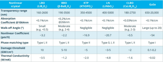 以下是常用非线性晶体在光学和非线性特性方面的比较: