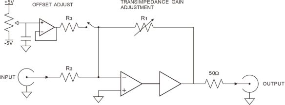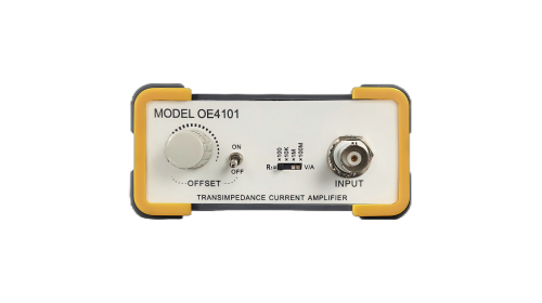 OE4101是跨阻电流放大器,通过负反馈结构,利用反馈电阻实现输入电流到电压的转换,并且控制放大倍数。