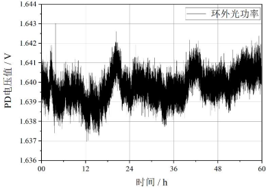 环外光功率测试结果。60h 数据 RMS 为 0.041%,前 24h 数据 RMS 为 0.043%,取平稳的 12h 数据 RMS 为0.028%,均小于 0.05%。此数据测量时,环境温度波动较大(13℃-17℃),实际会有更好的稳定度。