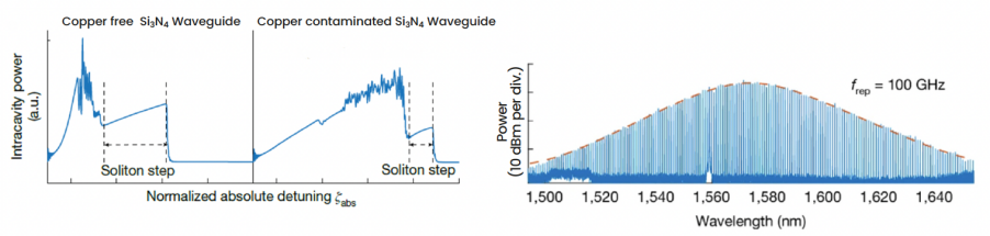 图2:铜污染对孤子步长的影响(左图);在无铜硅片上制造的、FSR为100GHz的氮化硅微谐振器产生的单孤子光谱(右图)