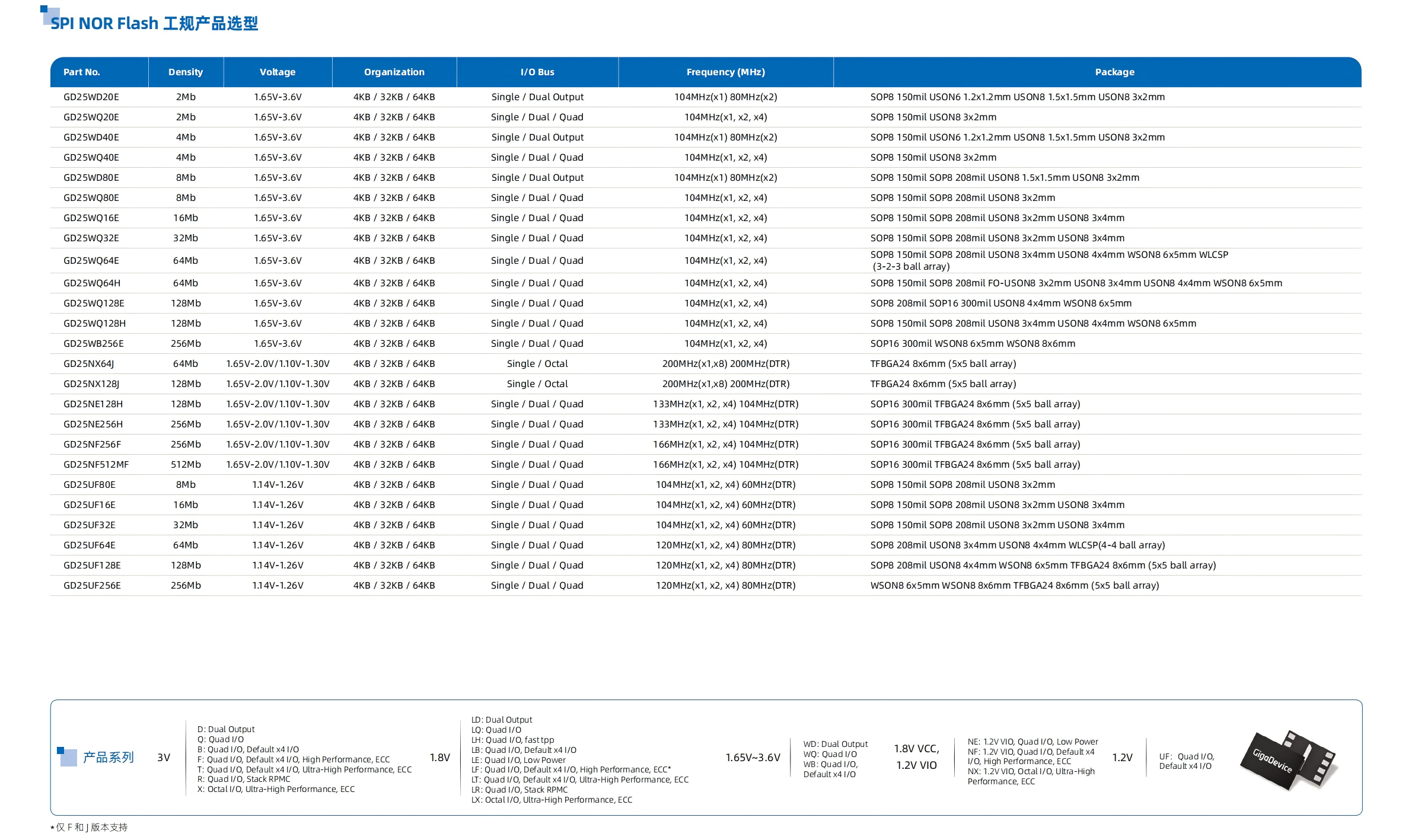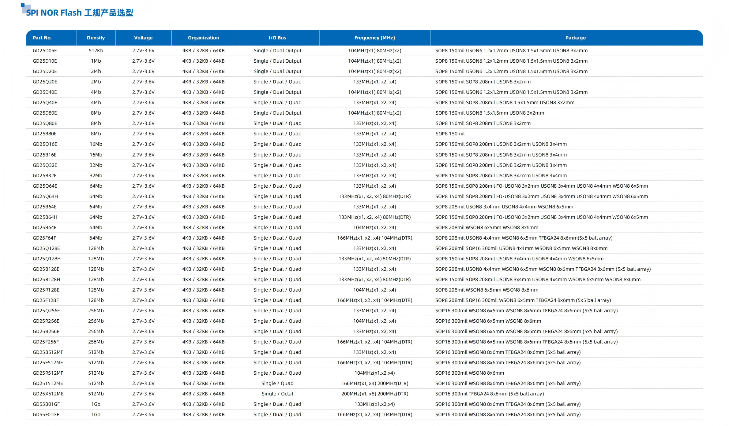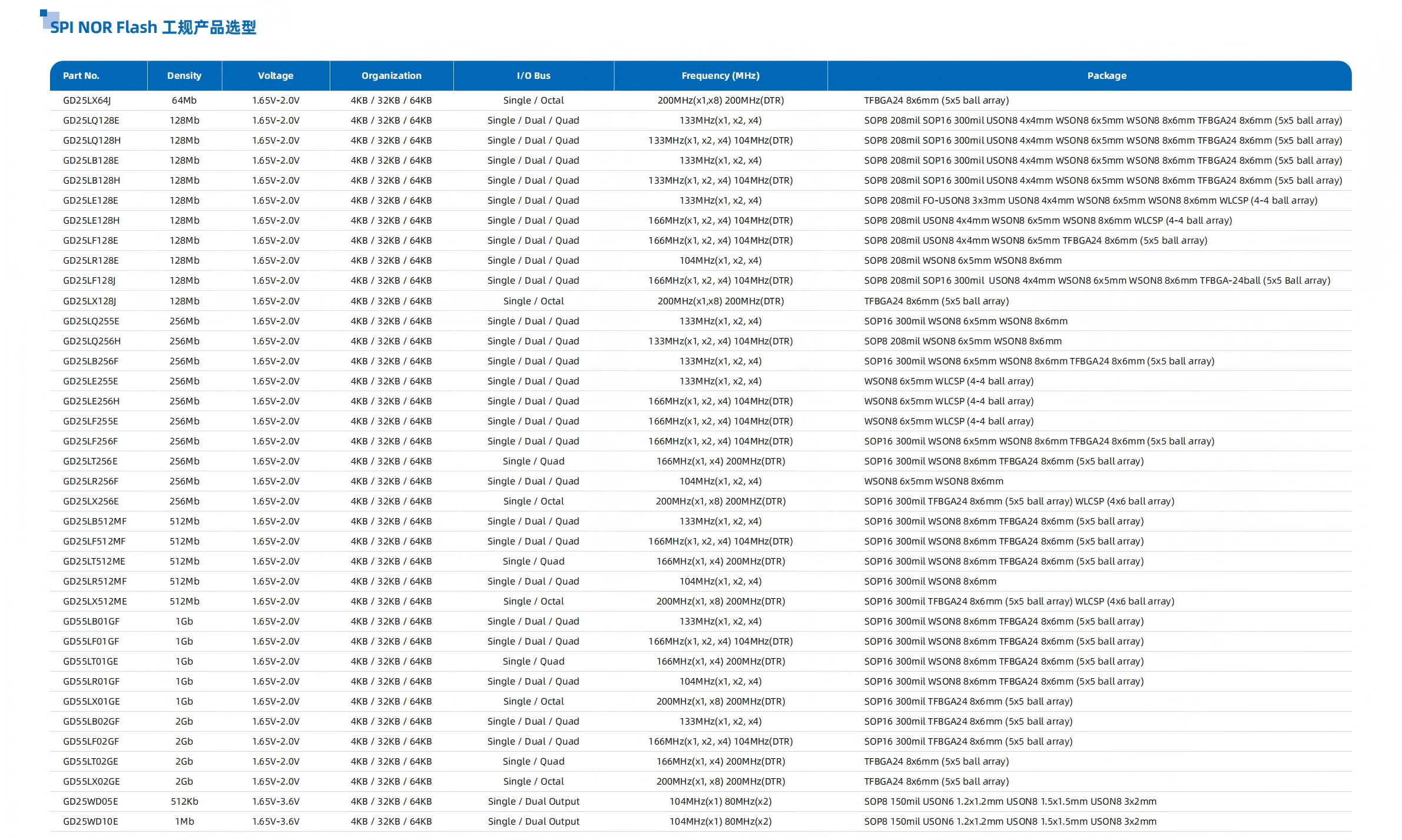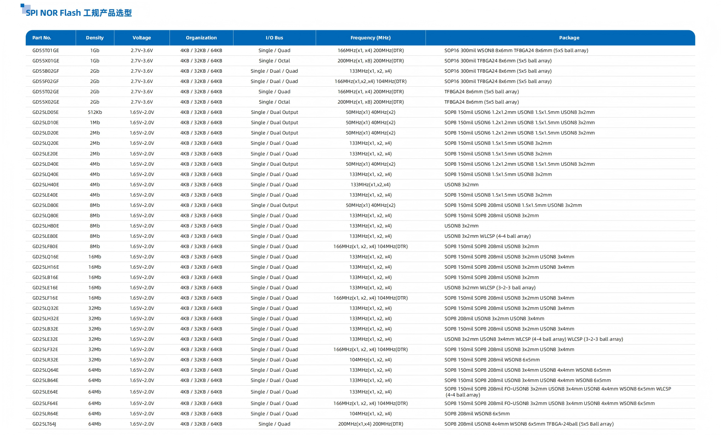 兆易创新SPI NOR Flash可提供512Kb到2Gb容量规格,并且,拥有四种不同电压范围,分别为3V、1.8V、1.2V以及针对电池供电应用推出的1.65V~3.6V宽压供电的产品系列;同时,提供多达20种不同的封装选项,可满足客户不同应用领域对容量、电压以及封装形式的需求。