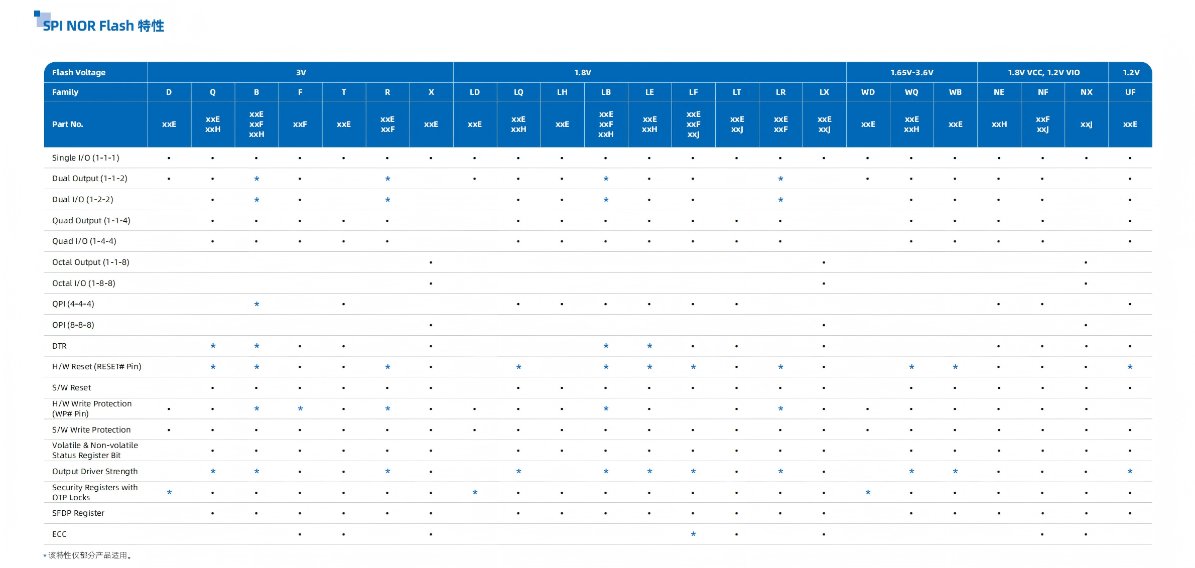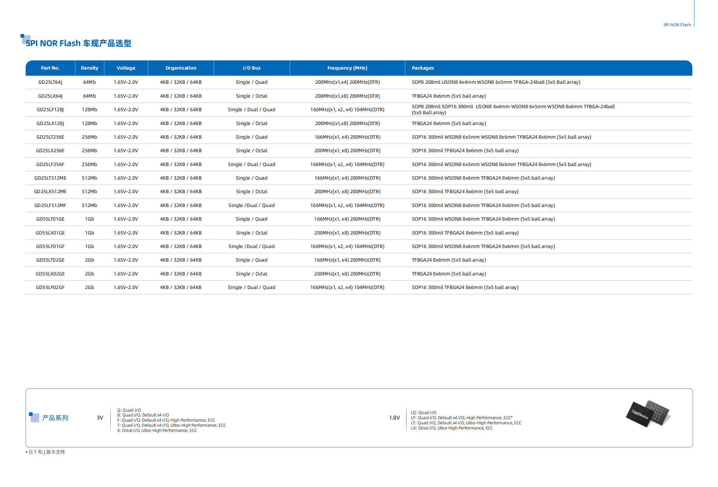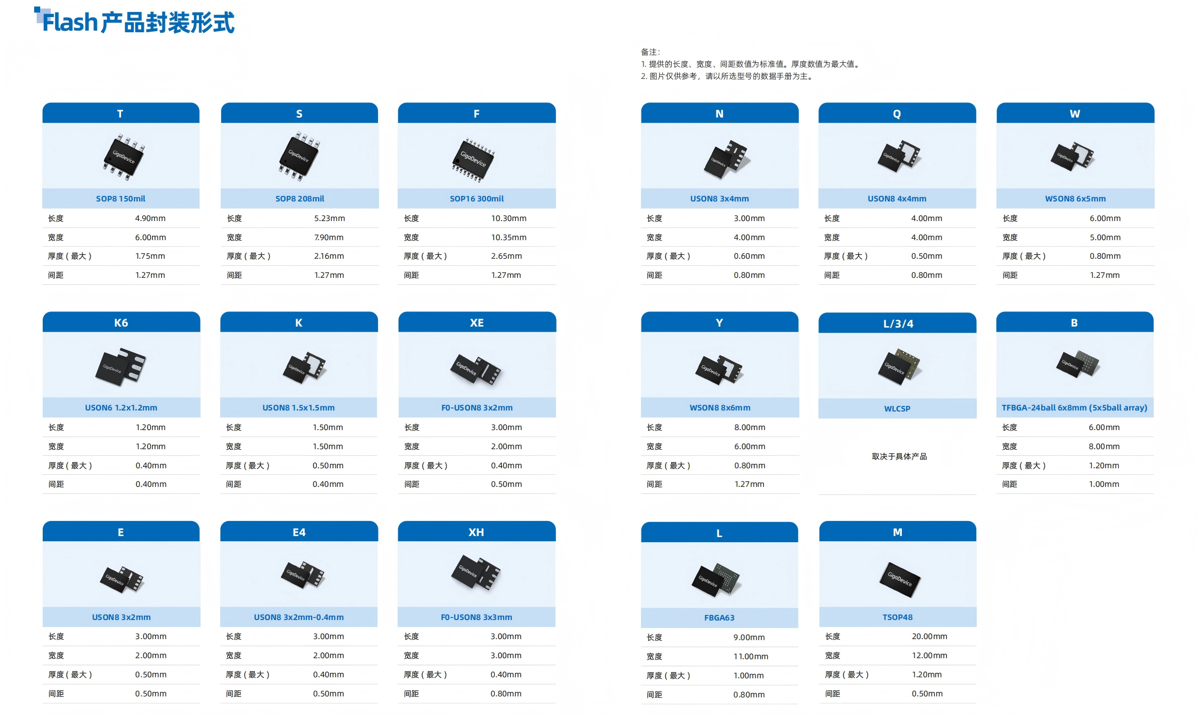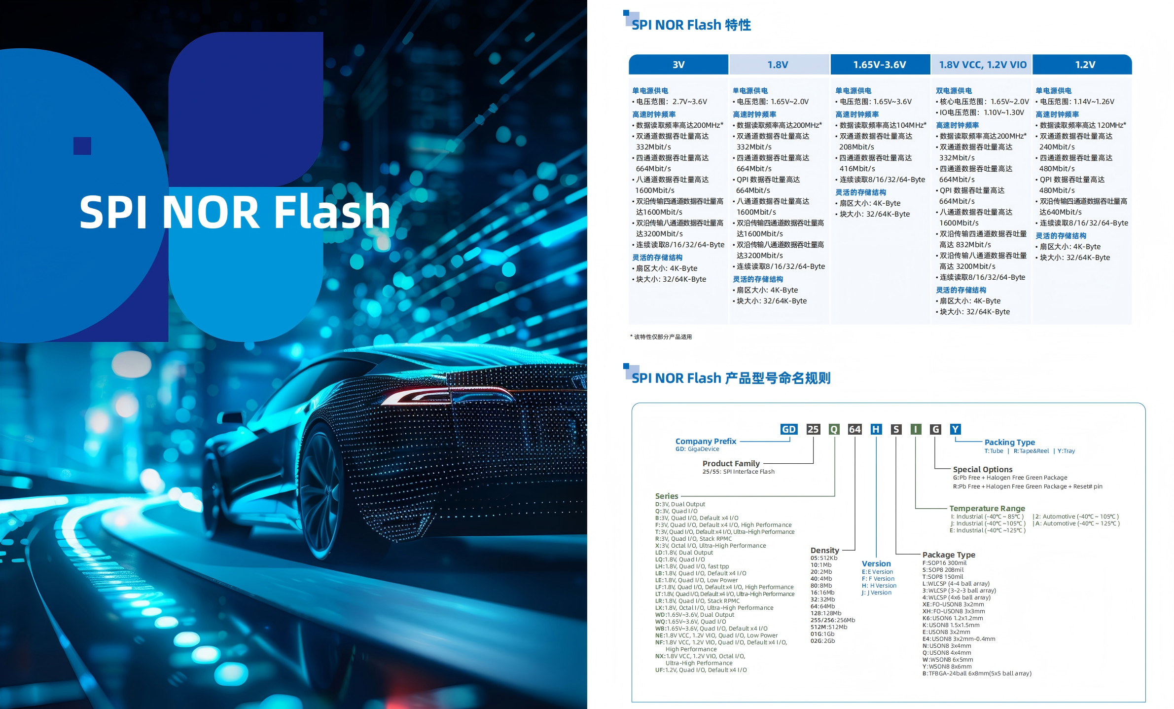 兆易创新SPI NOR Flash可提供512Kb到2Gb容量规格,并且,拥有四种不同电压范围,分别为3V、1.8V、1.2V以及针对电池供电应用推出的1.65V~3.6V宽压供电的产品系列;同时,提供多达20种不同的封装选项,可满足客户不同应用领域对容量、电压以及封装形式的需求。