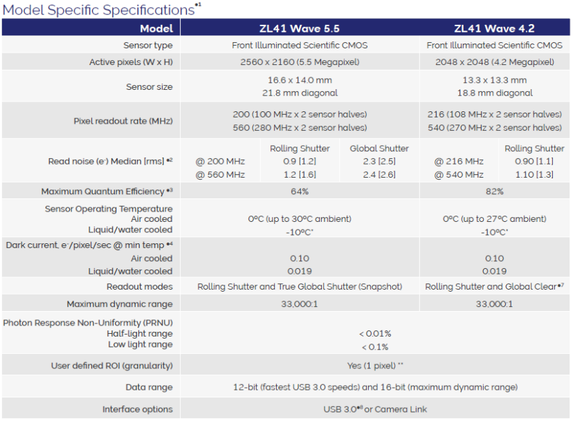 型号 | 分辨率 | 最大量子效率(%) | 支持快门 | 最大动态范围 |