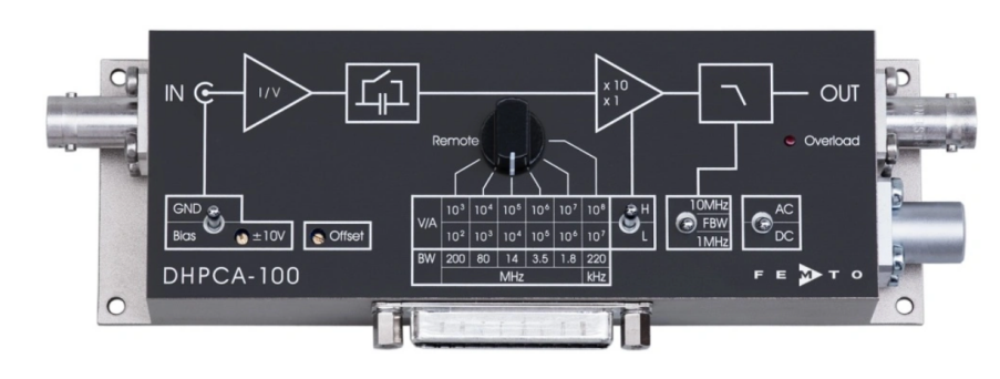 参数类别 具体参数 数值 / 说明 跨阻增益 调节范围 10² ~ 10⁸ V/A,支持多档位精准切换 带宽性能 -3 dB 带宽 低噪声模式:10² V/A 档位下 200 MHz,10⁸ V/A 档位下 0.22 MHz;高速模式:10³ V/A 档位下 175 MHz,10⁸ V/A 档位下 0.22 MHz 上升时间 10%~90% 上升沿 低噪声模式:10² V/A 档位下 1.8 ns,10⁸ V/A 档位下 1.6 μs;高速模式:10³ V/A 档位下 2.0 ns,10⁸ V/A 档位下 1.6 μs 输入噪声 等效输入噪声电流 低噪声模式:10² V/A 档位下 180 pA/√Hz,10⁸ V/A 档位下 45 fA/√Hz;高速模式:10³ V/A 档位下 155 pA/√Hz,10⁸ V/A 档位下 45 fA/√Hz 增益精度 跨阻增益误差 ±1%,确保信号放大的准确性 低通滤波 可选滤波档位 可切换至 1 MHz、10 MHz 或全带宽,有效抑制宽带噪声 输出特性 最大输出电压(50 Ω 负载) ±1 V 偏置电压 调节范围与电流限制 ±10 V,最大电流 22 mA,可切换至接地(GND),且连接至 BNC 屏蔽层 电源需求 供电电压与电流 ±15 V;典型电流:+110 mA /-90 mA,建议预留电流 ±200 mA;供电接口:3 针 Lemo® 插座,随设备提供配套连接器,可选电源 PS-15