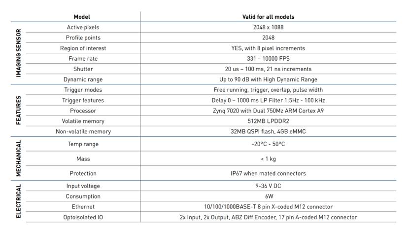 基于Optomotive公司的FPGA相机技术,帧率最高可达10000 FPS,2048×1088像素下可达340 FPS,动态范围可达90dB。Z轴分辨率最低达1.5μm,X轴分辨率最低达11μm。支持多轮廓同时检测与实时3D点云转换(单位:mm)。