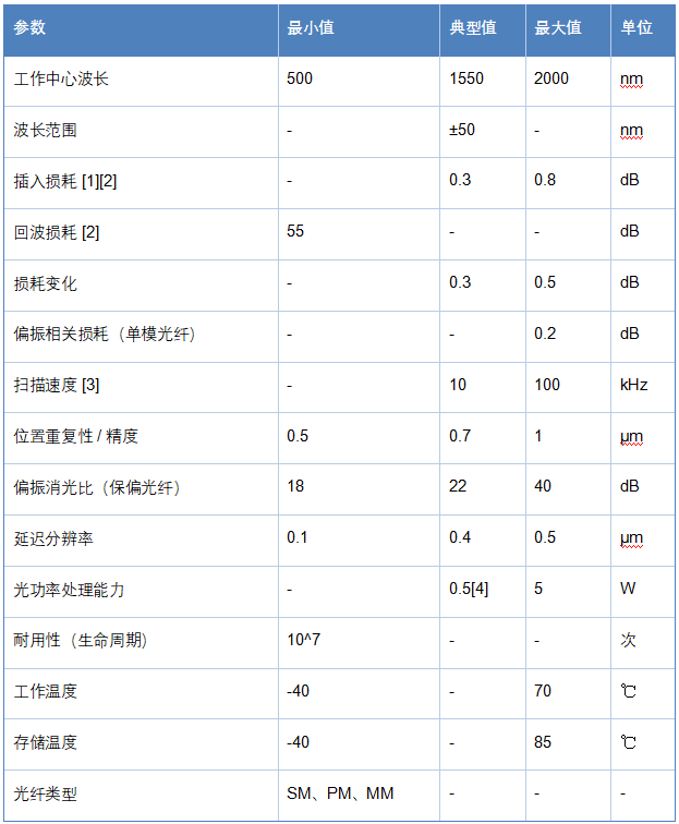 [2] 仅针对单模和保偏光纤版本测试。对于多模光纤版本,插入损耗受光源的芯径匹配度(CPR)和延迟范围影响较大,最小回波损耗为 35dB。