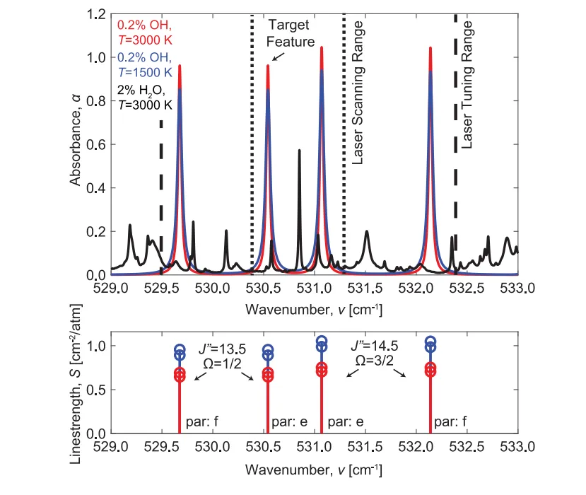 图:在本研究中使用的光源可获得的光谱范围内,用HITEMP【11】数据模拟羟基自由基和水干扰的吸光度。模拟是在2个大气压下用空气的碰撞展宽系数进行的。(底部)具有光谱标记的潜在目标跃迁的线强度。