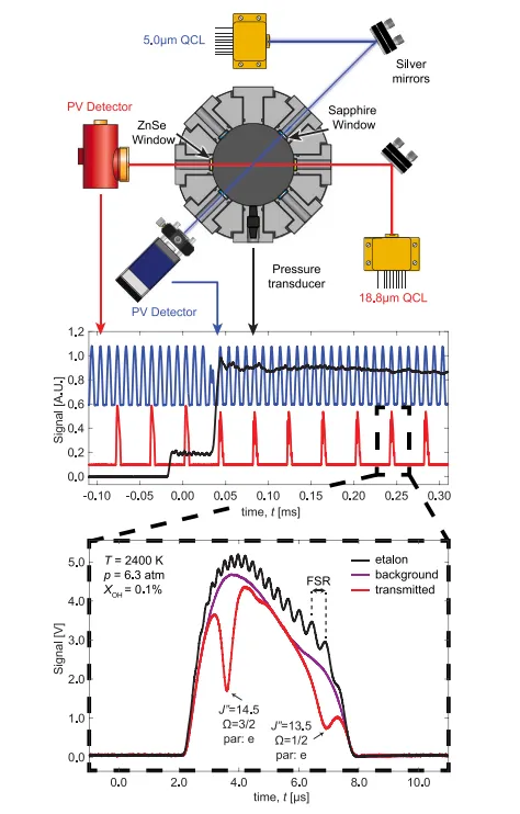 加州大学洛杉矶分校一个研究团队最近在《Proceedings of the Combustion Institute》期刊上发表了一篇论文,详细介绍了他们在高温下羟基自由基的THz旋转吸收光谱研究中取得的重大进展。为了实验能够达到预期,考虑谱线强度、温度敏感性和光谱干扰的,小组成员决定使用mirSense提供的室温可调谐脉冲量子级联激光器(QCL)在18.8μm(15.9THz)下进行羟基自由基吸收测量。以25kHz的测量速率和大约5μs的积分时间实现了多个跃迁的光谱分辨测量。同时,激光扫描范围内的相邻水线使得能够测量和减去水光谱,从而去除目标OH特征附近已经很小的水干扰。