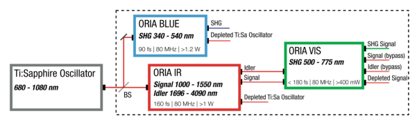 ORIA BLUE 是一款创新、易用且性能可靠的倍频装置,专为钛蓝宝石激光器设计,可高效将锁模超快钛蓝宝石激光器的近红外光输出(通常为 680-1080nm,对应波数 9259-14705cm⁻¹)转换为近紫外光与可见光光谱(340-540nm,对应波数 18518-29411cm⁻¹)。