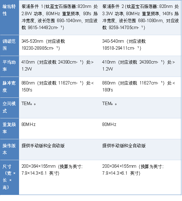 下表数据基于两种不同的钛蓝宝石振荡器泵浦条件得出,具体参数如下: