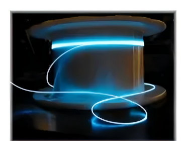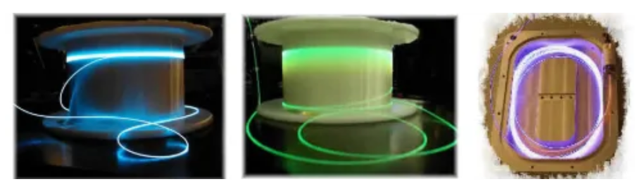 图3:稀土掺杂ZBLANI光纤的可见荧光,从左到右分别为铥掺杂、铒掺杂和钕掺杂。