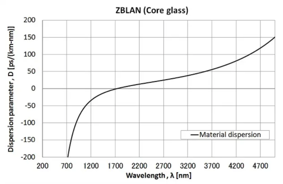 ZBLAN光纤在接近其零色散波长(ZDW)的波长处泵浦时,也是中红外超连续谱产生的高效介质。图2展示了ZBLAN玻璃的材料色散,显示材料色散在1.7微米左右变为零。因此,ZBLAN光纤的零色散波长通常位于1.7-1.9微米左右,而在该波段有商用的高功率脉冲激光源。