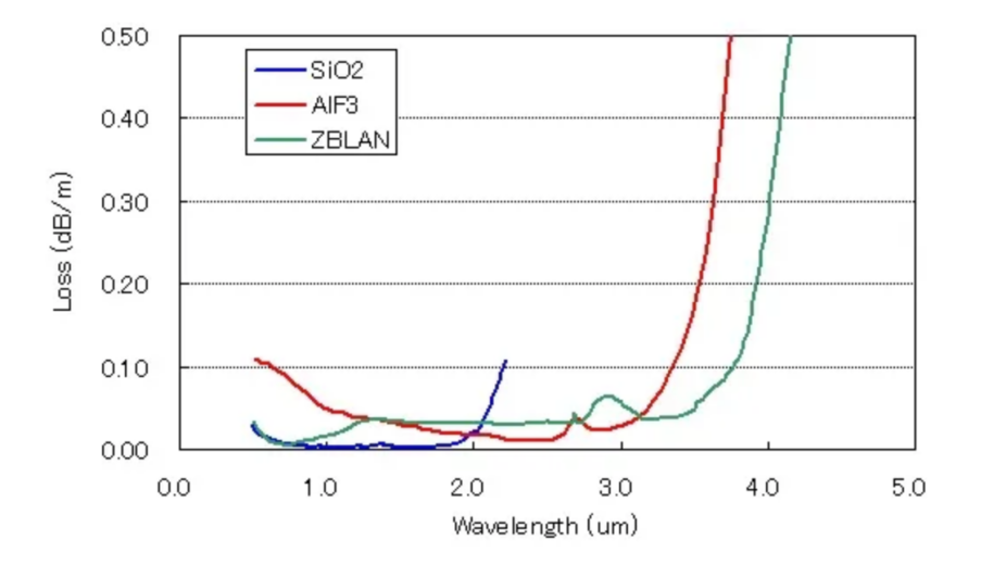 图1展示了三种不同类型玻璃纤维(ZBLAN、AIF3和二氧化硅)的损耗光谱。在这三种纤维中,ZBLAN纤维拥有最宽的传输窗口,范围从0.4到4微米。因此,ZBLAN纤维适合作为近红外(NIR)和中红外(MIR)波段的宽带光导介质,例如在光谱学中。