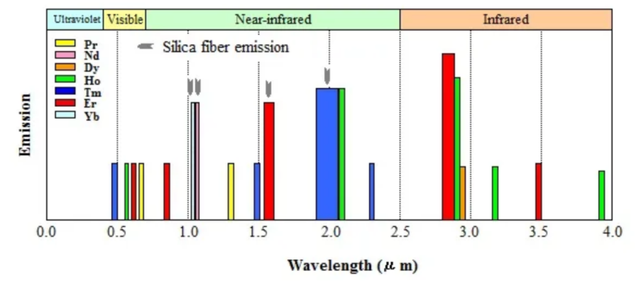 图4展示了掺稀土ZBLAN光纤在可见光、近红外(NIR)和中红外(MIR)波段的各种发射波长。图中还标记了掺稀土石英光纤所能实现的四个主要发射波长。有许多光谱区域只有ZBLAN光纤能够覆盖。例如,在近红外波段约1.31微米和1.45微米处的发射,这在光通信中具有重要意义,可通过ZBLAN光纤获得。中红外波段的发射也是ZBLAN光纤的特征。ZBLAN光纤的这些独特特性使我们能够在各种光谱区域制造光源(光纤放大器、放大自发辐射光源、光纤激光器)。玻璃成分和光纤设计的细微差异也会影响发射效率。